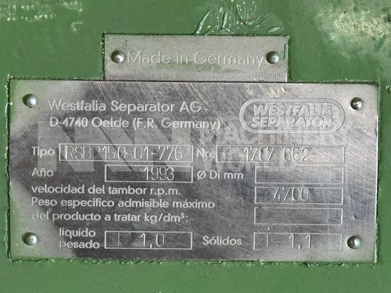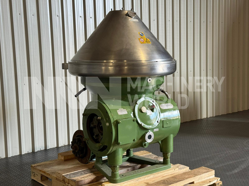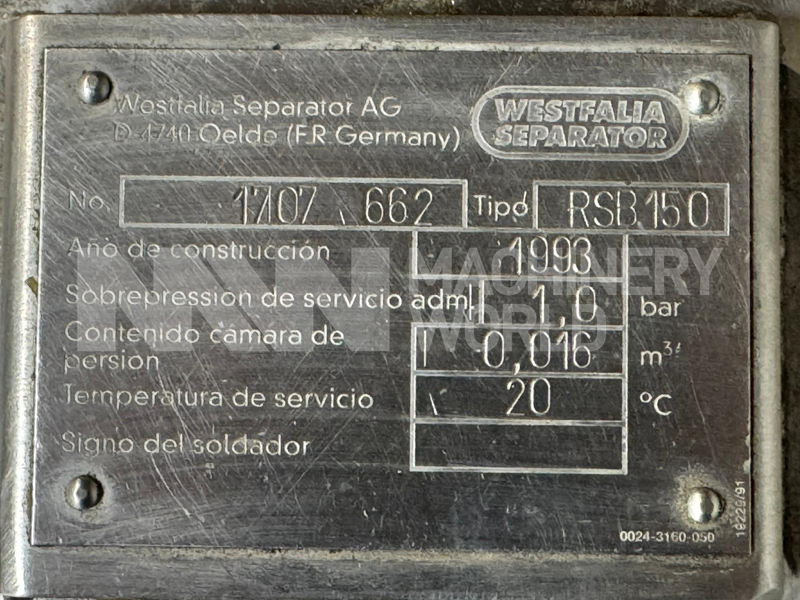 A robust pre-owned disc stack centrifuge designed for efficient separation and clarification of vegetable oils in edible oil processing plants. Manufactured in 1993 by the renowned German engineering company Westfalia GmbH, this separator is built for reliable continuous operation and effective removal of water and solids from vegetable oil streams.